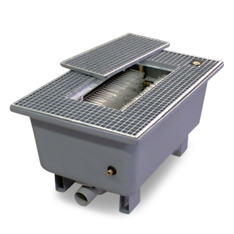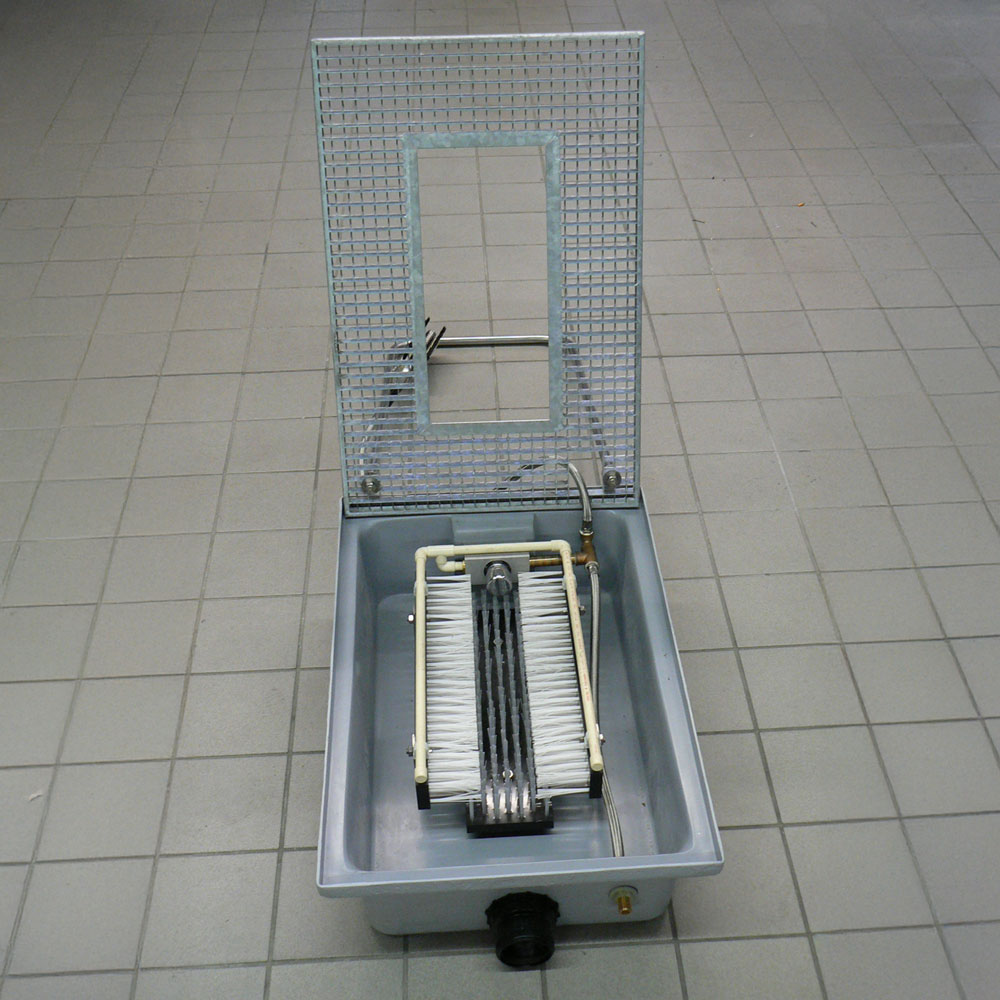 Stationäre Stiefelwaschanlage zum bodenbündigen oder teilversenkten Einbau in Fussböden für Feuerwehrgerätehäuser, Truppenunterkünfte, gewerbliche und landwirtschaftliche Betriebe. Unsere meistverkaufte stationäre Stiefelwaschanlage!