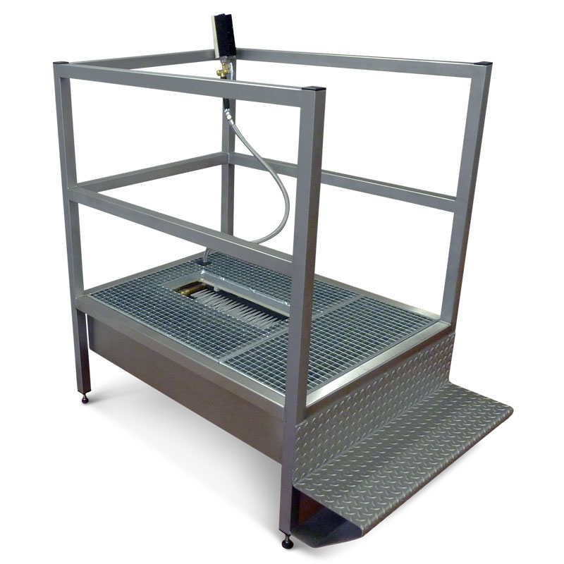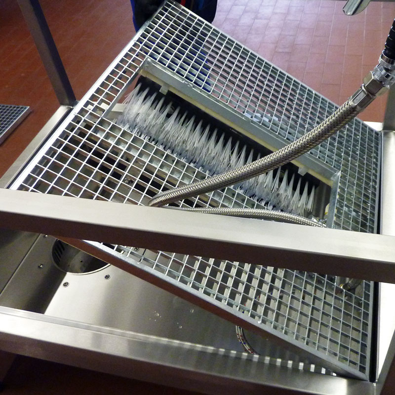 Die Wanne dieses Stiefelwaschers ist mit zwei feuerverzinkten Gitterrosten mit mittigem Ausschnitt abgedeckt. An der Vorderseite des Ausschnitts ist ein automatisches Wasserstoppventil angebracht, das mit der Fussspitze betätigt wird. Seitliche Spülrohre leiten das Wasser über die Bürsten auf das Schuhwerk. Eine wasserführende Handbürste aus Edelstahl (mit Absperrung über Handhebel-Schnellschlussventil) ermöglicht eine zusätzliche manuelle Reinigung des Stiefelschafts oder anderer zu reinigender Gegenstände. Ein in der Edelstahlwanne des Stiefelreinigers integrierter Ablauf mit Schlammfang und Geruchverschluss ermöglicht einen optimalen Wasserablauf sowie das separate Auffangen von Grobschmutz. Zur einfachen Reinigung der Stiefelwaschanlage und Leerung des Schlammfangs kann der vordere Rost von der Anlage entfernt werden.