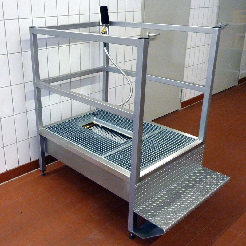 Der Aufbau der Stiefelwaschanlage erfolgt ebenerdig, auf dem Fussboden. Verstellbare Füsse ermöglichen einen sicheren Stand. Das Geländer bietet zusätzlichen Schutz und Haltemöglichkeiten. Als Option ist eine Version mit Haltebügel anstelle des Geländers erhältlich.