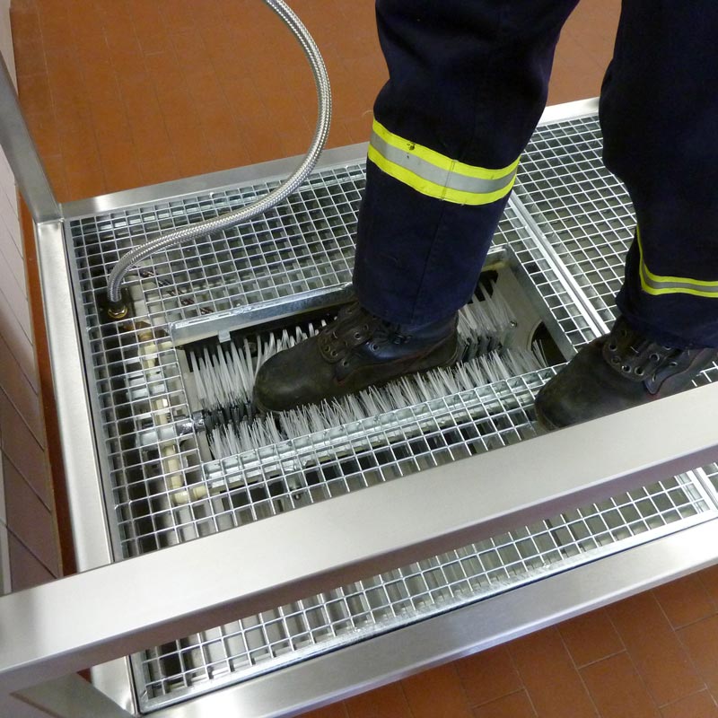 Die Stiefelwaschanlage Feuerwehr besteht aus einer speziell gefertigten Edelstahlwanne mit einem feuerverzinkten Gitterrosteinsatz mit Sohlen-, und Seitenbürsten. Es handelt sich um einen professionellen Stiefelreiniger für den intensiven Einsatz bei der Feuerwehr, der Polizei oder im Baubetrieb.